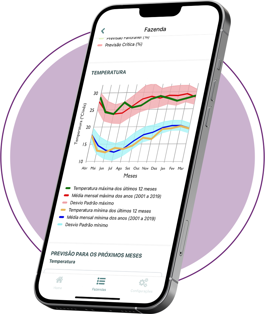 Acompanhe como seu talhão se comporta neste ano com relação a média e tenha acesso a uma previsão de tendência da chuva e temperatura para os próximo 3 meses de forma a planejar melhor o período futuro, reduzir a vulnerabilidade e grandes flutuações climáticas e avaliar o risco futuro.